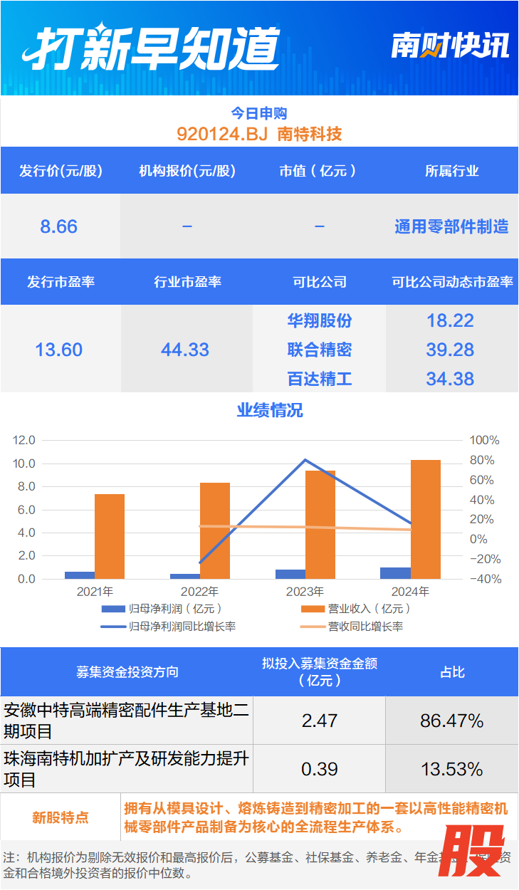 11月11日,可申购北交所的南特科技(920124.BJ)。该公司主要从事精密机械零部件的研发、生产及销售,主要产品为压缩机零部件、汽车零部件。公司先后获得广东省专精特新中小企业、广东省创新型中小企业、国家级高新技术企业等荣誉,公司研发中心被认定为“广东省工程技术研究中心”。
